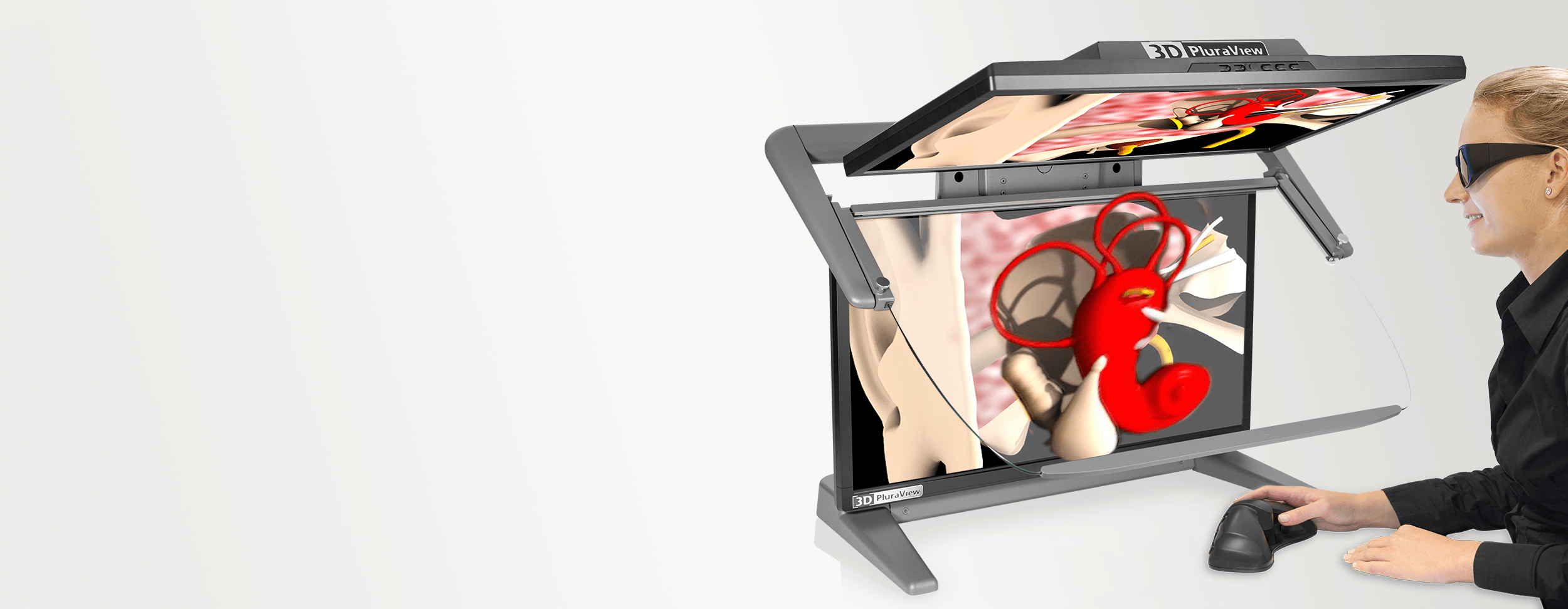 Volumetric 3D images and models are of increasing importance in the medical sector. The high-resolution 3D PluraView stereo monitors from Schneider Digital are a perfect fit for the 3D-stereo display of medical data, especially from CT and MRI scanners. In contrast to other 2D and 3D desktop monitors, the PluraView have dual screens with passive beam-splitter technology to provide a realistic stereo 3D experience, comparable to a highly detailed holographic display. Combined with medical software and a suitable graphics card in a tower or laptop workstation, the PluraView stereo monitors provide a turnkey 3D workplace solution for the medical sector for viewing and analyzing volumetric medical data conveniently and efficiently, while presenting it at maximum resolution and flicker-free, even in daylight office conditions.